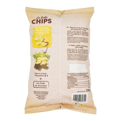 Pomme de terre 56%, huile de tournesol 36%, assaisonnement saveur fromage des montagnes 7% (lactosérum (LAIT), poudre de crème (LAIT), sel, poudre de fromage fondu (0,9% de comté) (LAIT), fécule de pomme de terre, arômes naturels, épice).